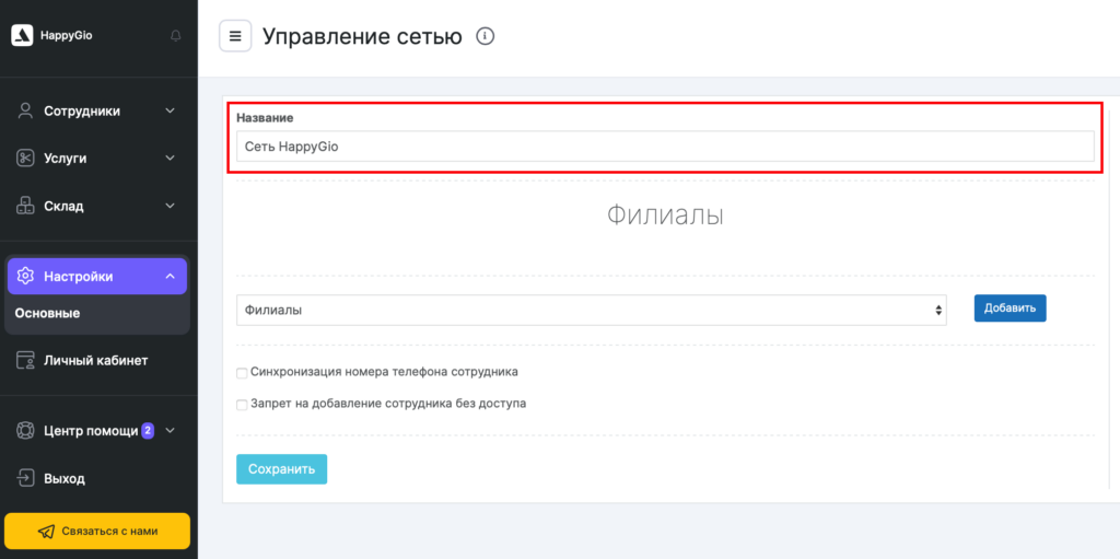 Altegio автоматически направит вас на страницу управления сетью в раздел Настройки > Основные (в сетевом интерфейсе).