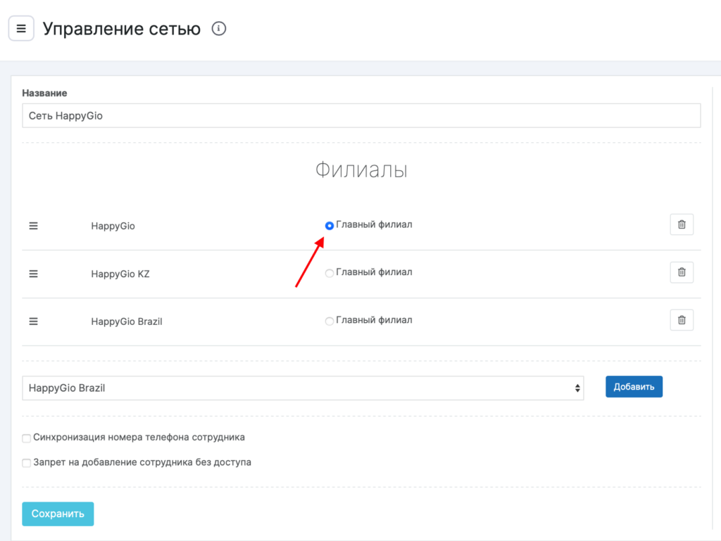 - Выберите главный филиал и нажмите кнопку Сохранить.