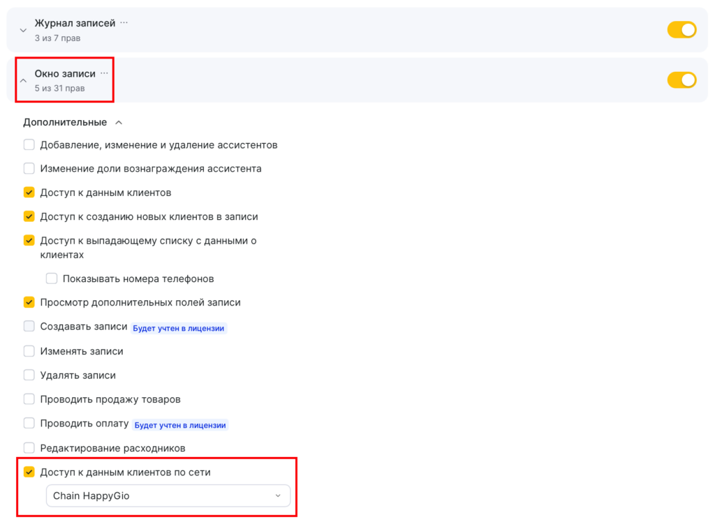Подробнее об этих настройках в статье Права доступа к окну записи.
