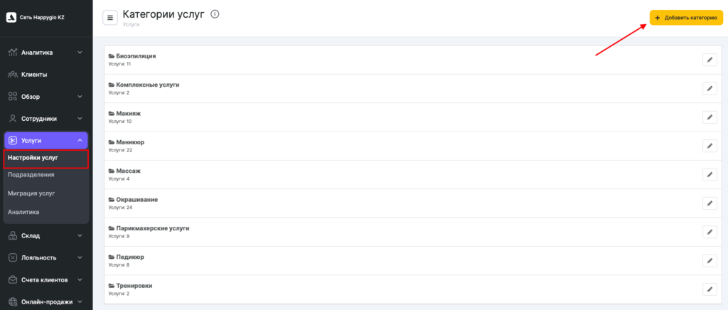 - Перейдите в раздел Услуги > Настройки услуг. Здесь вы можете добавить категорию услуг и создать услуги в этой категории. Созданная в этом разделе категория будет сетевой.