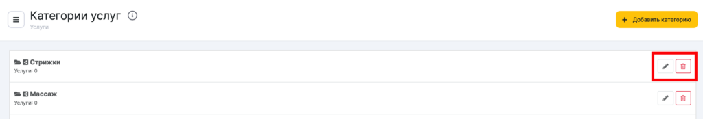- Чтобы отредактировать информацию о категории, нажмите кнопку карандаша, чтобы удалить ее, нажмите иконку корзины.