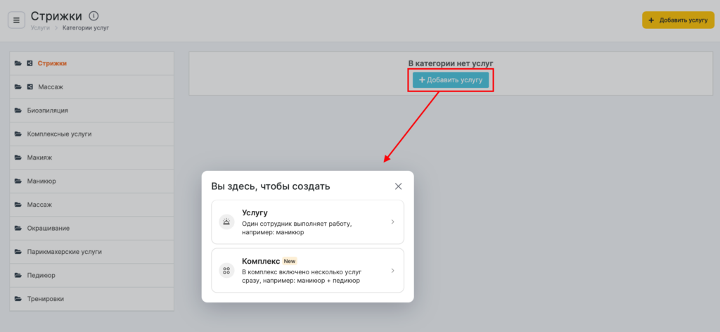 - Добавьте услуги в категорию. Для этого нажмите на ее название, появятся кнопки Добавить услугу, нажмите на любую из них.