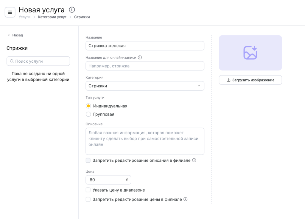- Укажите название услуги и название для онлайн-записи (это название будут видеть клиенты при онлайн-записи, если поле оставить пустым, будет использоваться основное название услуги). Выберите категорию, к которой относится данная услуга. Укажите, будет ли доступна эта услуга для групповой записи. Добавьте изображение, отражающее суть услуги.