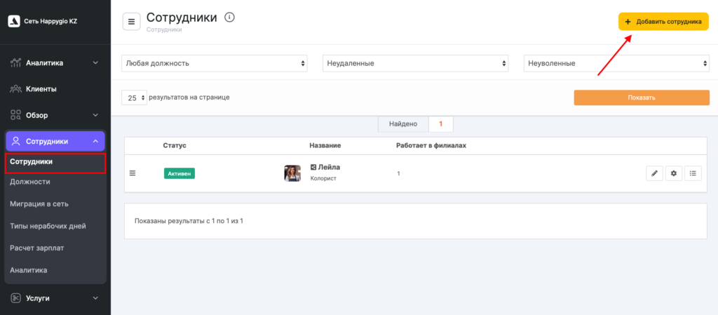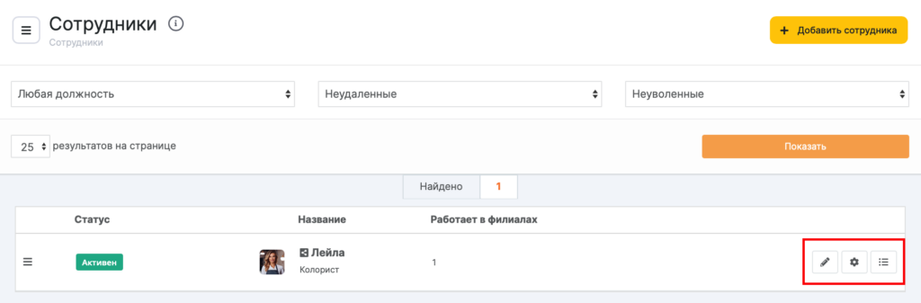 Для удобства вы можете просмотреть сотрудников выборочно. Для этого отфильтруйте список по должности (подробнее о назначении и настройке раздела Должности читайте здесь) или статусам Удаленные/Неудаленные, Уволенные/Неуволенные и нажмите кнопку Показать.