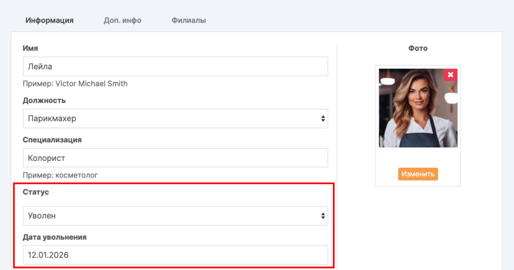 2. На вкладке Информация выберите статус Уволен и укажите дату увольнения, если нужно убрать сотрудника из списка, но при этом сохранить всю статистику по нему.