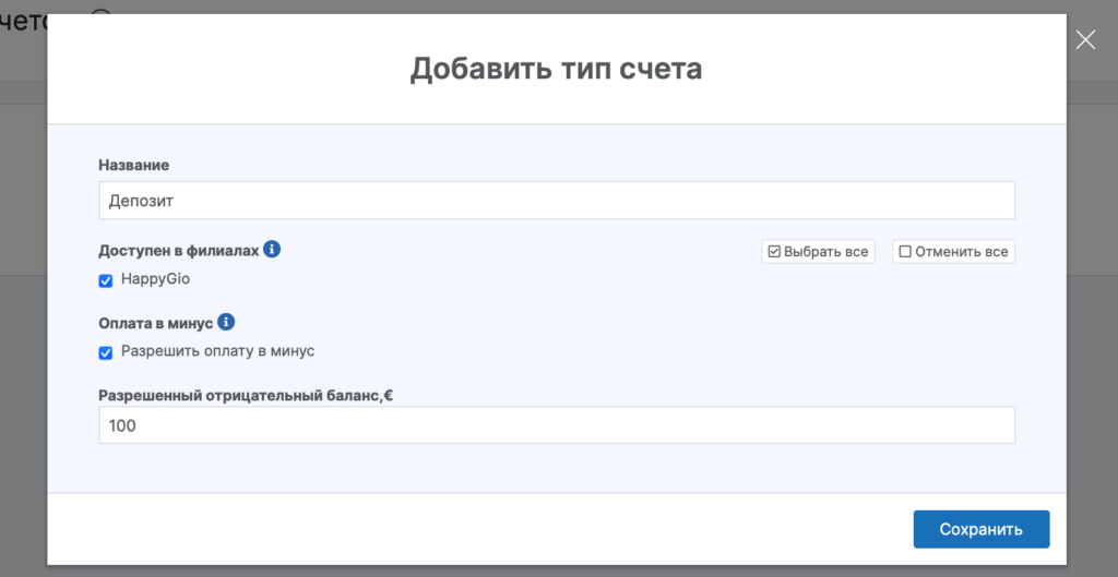 - Укажите название типа счета, например, Депозит. Выберите филиалы, в которых будет доступен тип счета.
