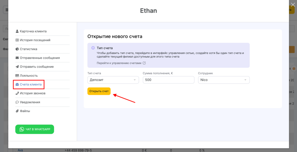 - Откройте счет клиенту. Для этого в карточке клиента в филиале (в разделе Клиенты > Клиентская база или в блоке Клиент в окне визита) перейдите в раздел Счета клиента, выберите тип счета, при необходимости укажите первоначальный баланс и сотрудника, который открыл счет. Нажмите кнопку Открыть новый счет и проведите оплату.