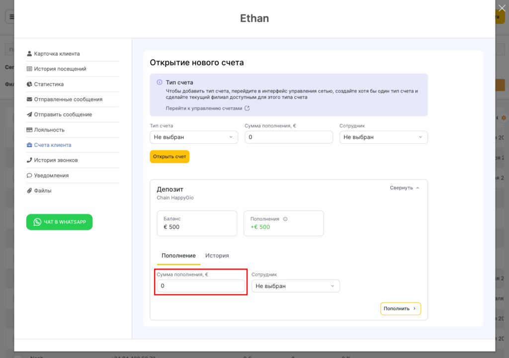 - Для пополнения счета перейдите в раздел Счета клиента в карточке клиента, в блоке счета нажмите на Развернуть, введите сумму пополнения, при необходимости укажите сотрудника и нажмите кнопку Пополнить