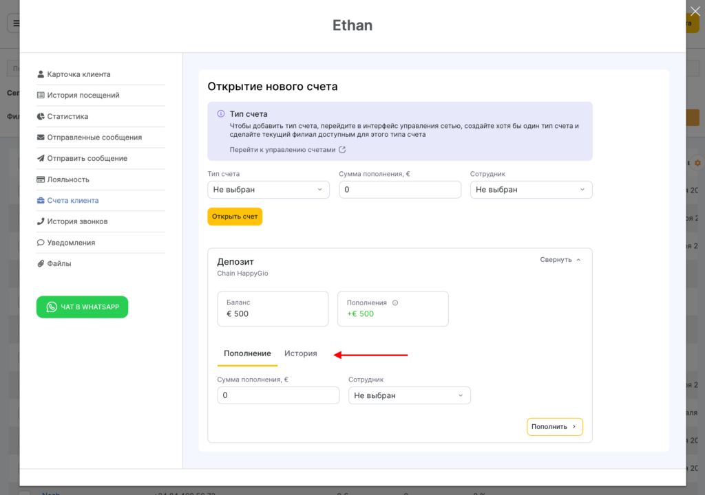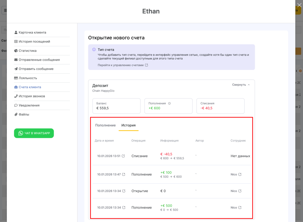 - В карточке клиента в разделе Счета клиента отобразится история списания и пополнения.