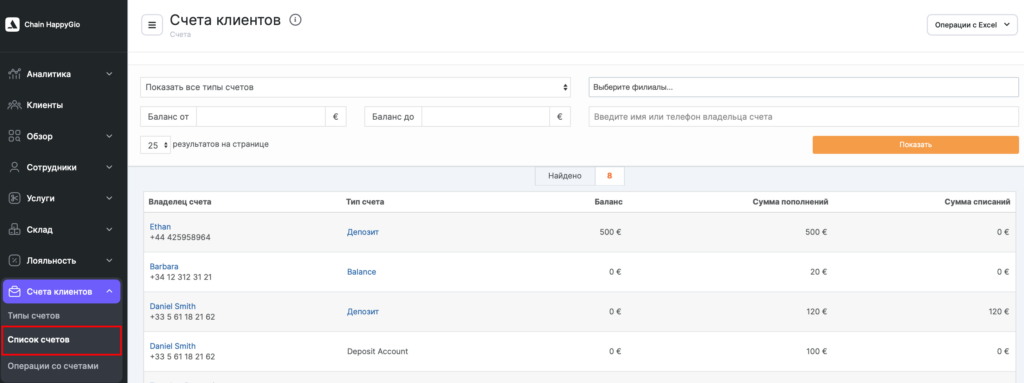 Возможен перенос данных о счетах клиентов из другой системы с помощью загрузки через Excel, для этого обратитесь к вашему персональному менеджеру Altegio. Его контакты можно найти в интерфейсе филиала в разделе Обзор > Сводка.