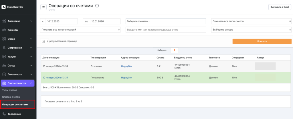 - В сетевом разделе Счета клиентов > Операции со счетами отображаются все манипуляции, которые были сделаны: открытие, пополнение, списание.