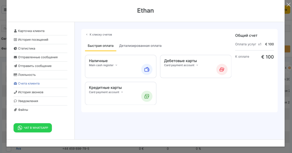 - Чтобы использовать средства со счета для оплаты товаров и услуг в окне визита перейдите к оплате и выберите опцию Личный счет клиента.