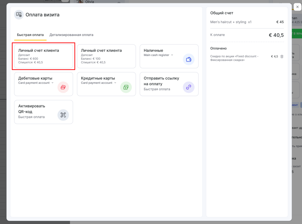 - Окно записи > Проводить оплату > Проводить оплату с личного счета клиента