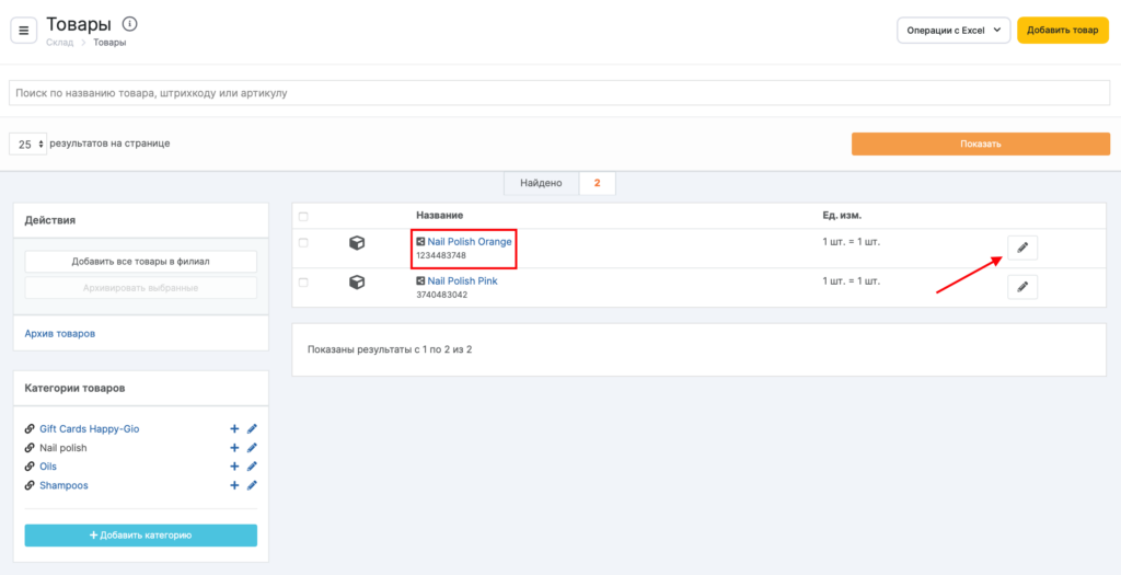 Для того чтобы отредактировать информацию о товаре, перейдите в карточку товара. Для этого нажмите на карандаш или на название товара.