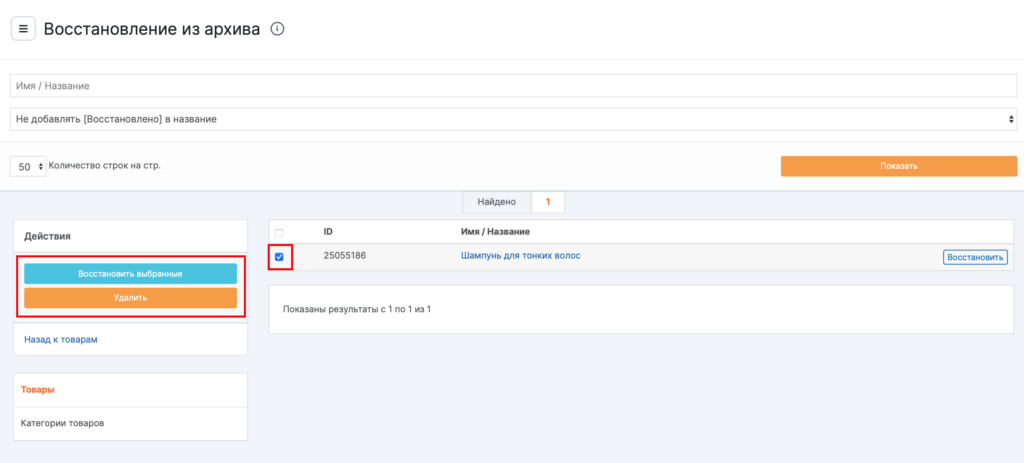 - Отметьте товар, который хотите восстановить или удалить, и нажмите соответствующую кнопку.