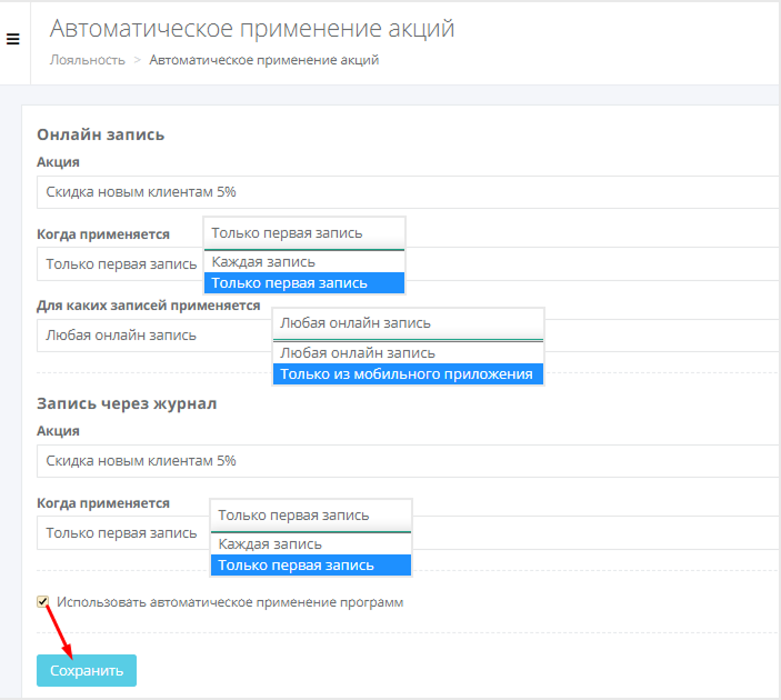 В сетевом интерфейсе перейдите в раздел Лояльность > Автоприменение акций.