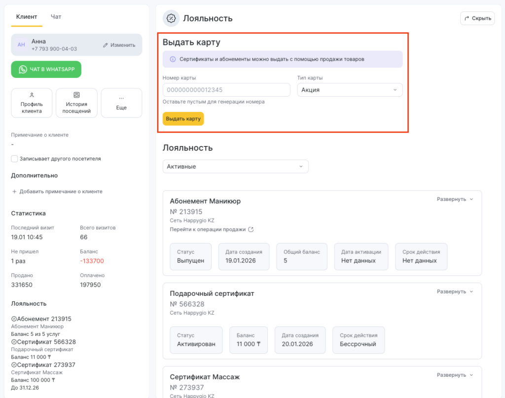И в окне визита и в карточке клиента перейдите в раздел Лояльность, укажите номер карты или оставьте поле пустым для генерации номера, выберите тип карты и нажмите кнопку Выдать карту.