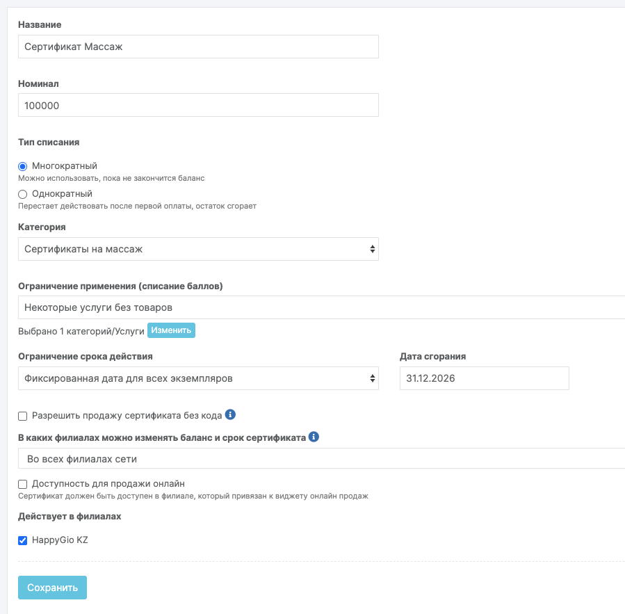 - Поставьте галочку Доступность для продажи онлайн, если планируете продавать сертификат онлайн.