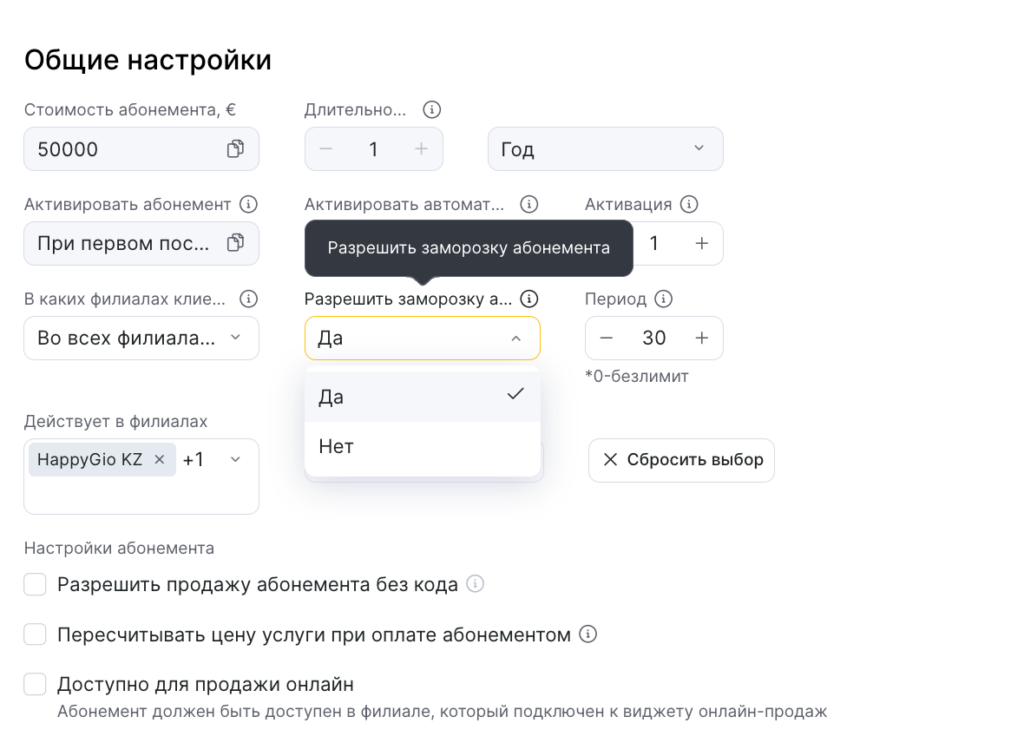 Если возможность заморозки не была включена при создании, тип абонемента можно отредактировать и включить заморозку. Подробнее о редактировании типа абонемента можно прочитать в статье.