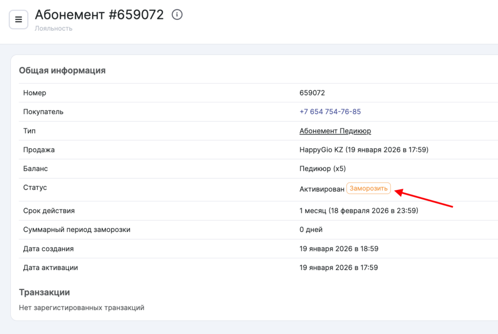 Если при создании типа абонемента вы включили возможность заморозки, вы сможете приостановить действие абонементов этого типа.