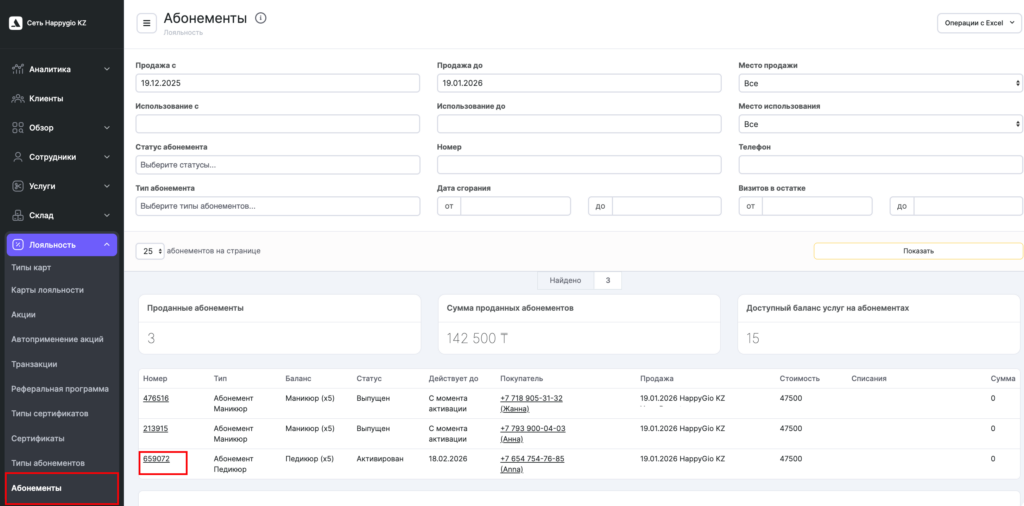 - Перейдите в сетевой раздел Лояльность > Абонементы и нажмите на номер абонемента, действие которого необходимо приостановить.