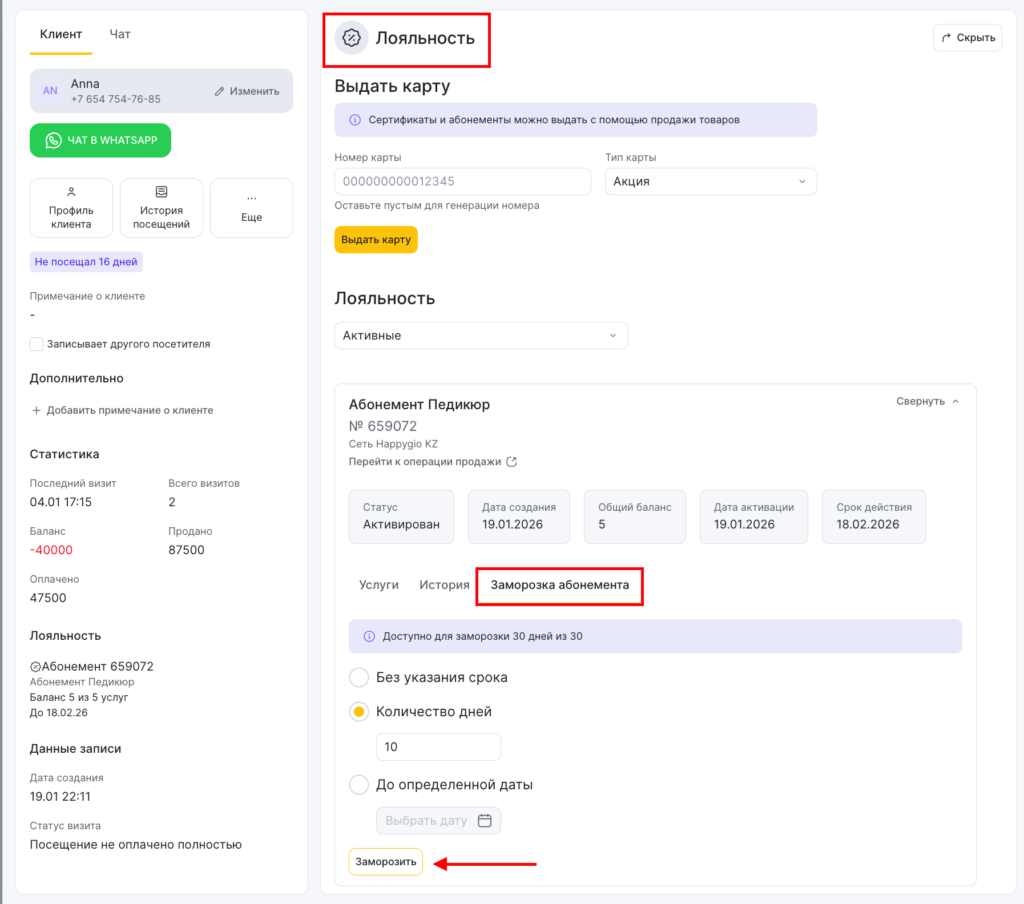 - Для заморозки абонемента в карточке клиента в клиентской базе или в окне визита перейдите на вкладку Лояльность. В подразделе Заморозка абонемента выберите нужный период и нажмите кнопку Заморозить.