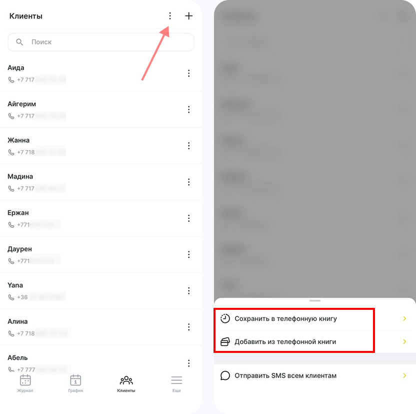 В мобильном приложении вы можете загрузить контакты из телефонной книги вашего устройства в Altegio или выгрузить клиентскую базу на смартфон или планшет.