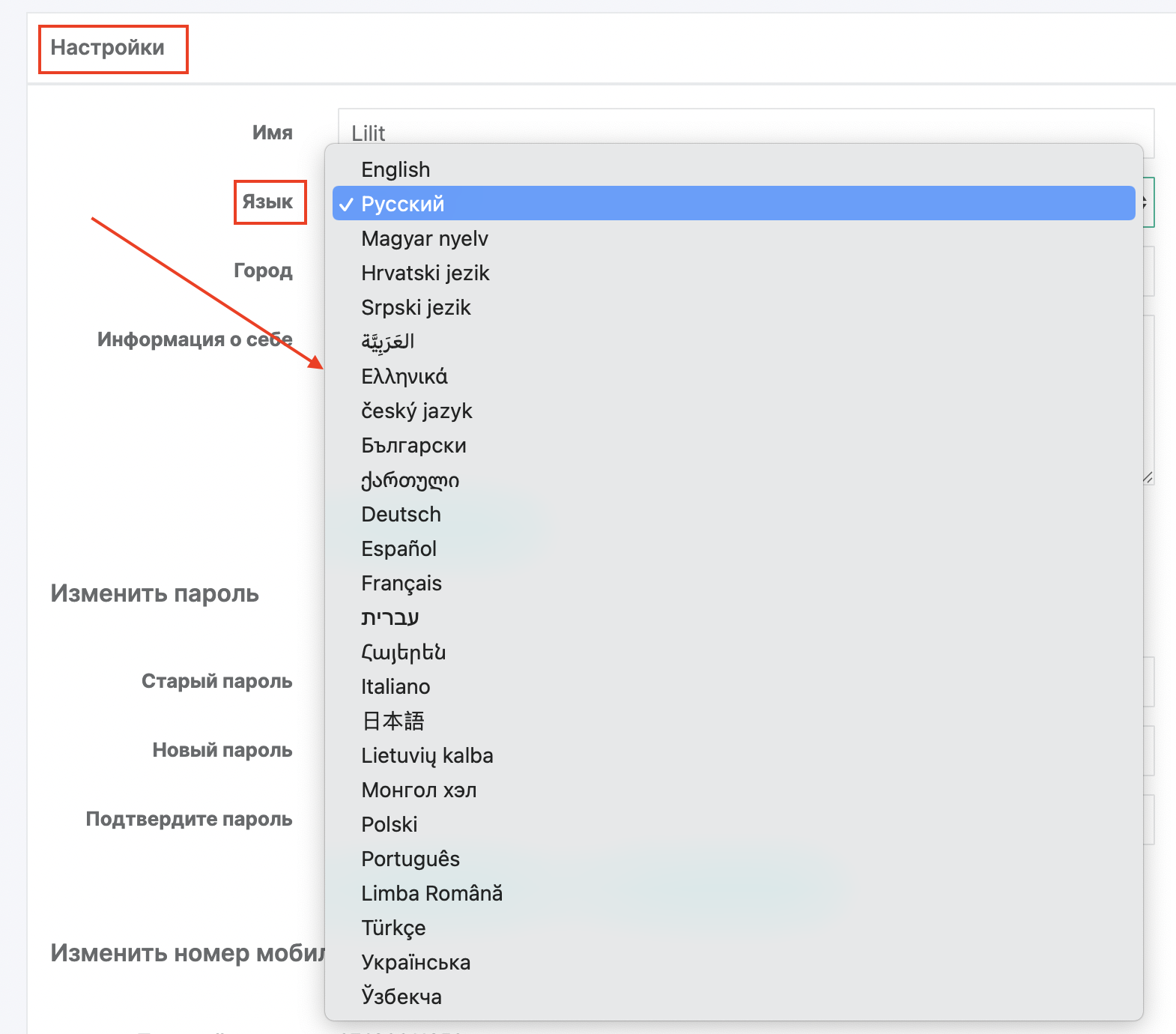 Чтобы изменить язык, в блоке Настройки необходимо нажать на выпадающий список языков в разделе Язык.