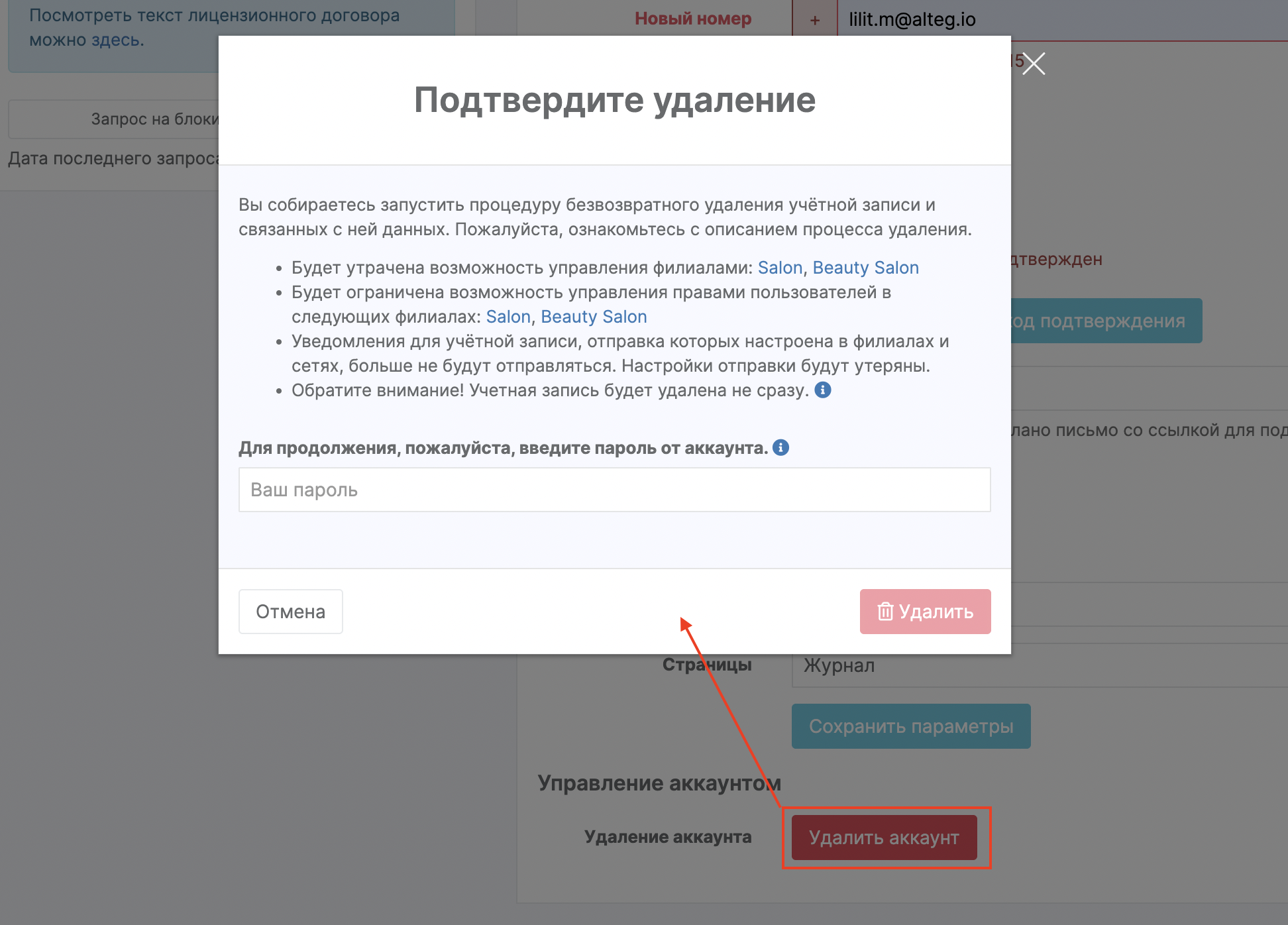 Управление аккаунтом. Для удаления учетной записи нажмите на кнопку «Удалить аккаунт» и во всплывающем окне введите свой пароль. После подтверждения аккаунт удаляется не сразу, а через 25 дней после запроса. В течение этого срока можно продолжать пользоваться аккаунтом или отменить удаление. По прошествии 25 дней данные будут безвозвратно удалены из Altegio.