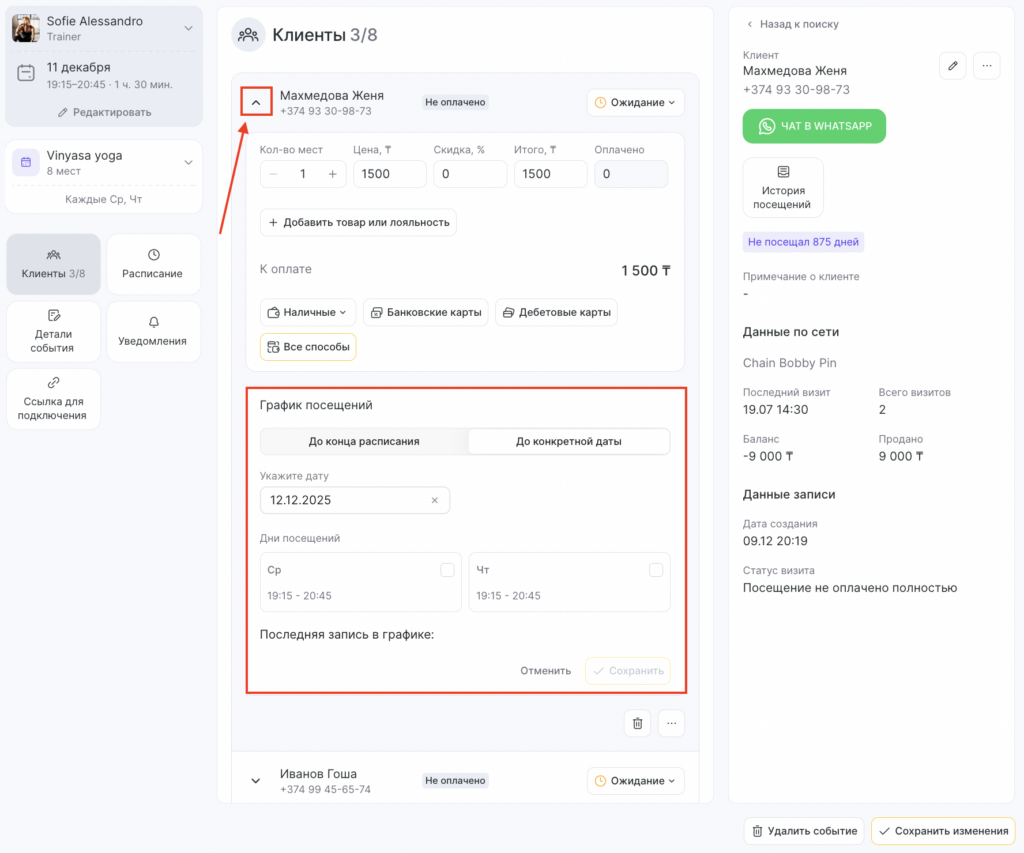 Если клиент уже добавлен в событие, для которого было создано расписание, для него также можно отредактировать график посещений.