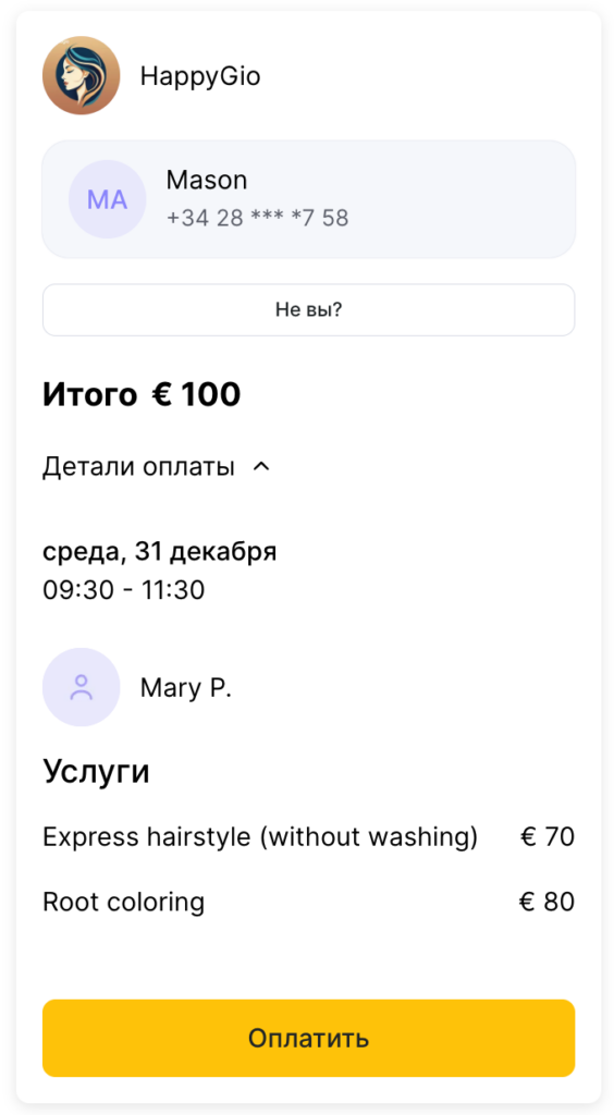 Клиент переходит по ссылке, проверяет детали визита и оплачивает онлайн.