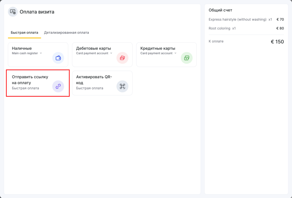 - Выберите способ оплаты Отправить ссылку на оплату (если доступно для вашей платежной системы).