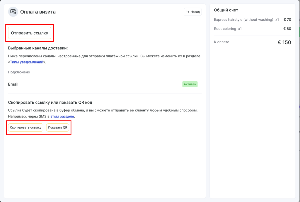 Администратор отправляет платежную ссылку из окна визита или клиент сканирует QR-код.