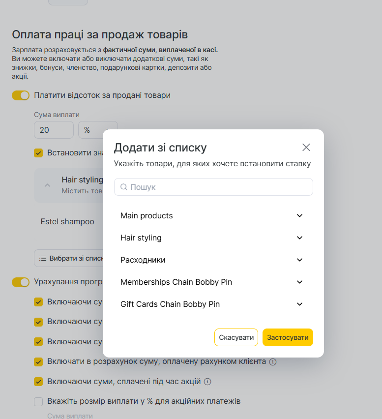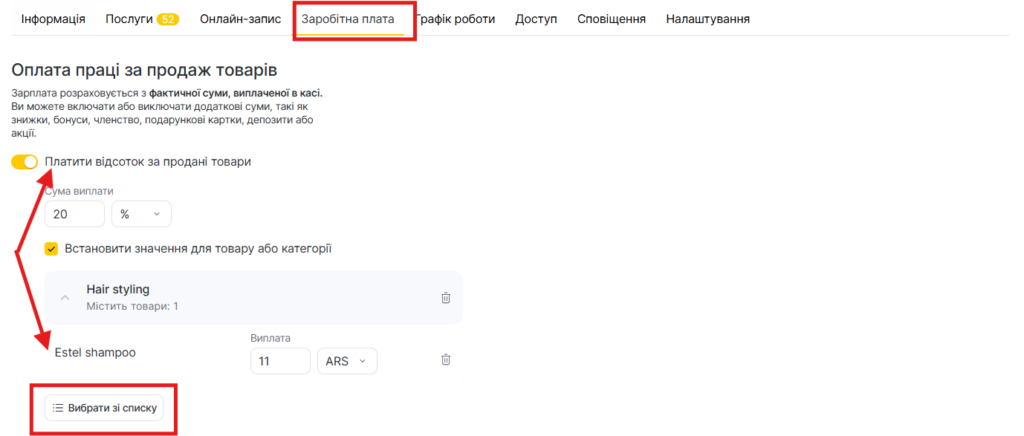 - Встановіть відсоток від ціни товару або фіксовану суму виплати. Як і в налаштуваннях послуг, можна задати єдине значення для всіх товарів або встановити окремі значення для категорій чи конкретних товарів.
