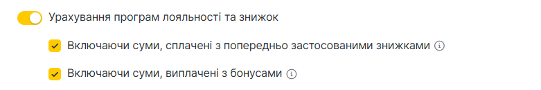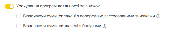 - Попередньо застосована знижка клієнта — чи враховувати суму, яка була зменшена через знижку