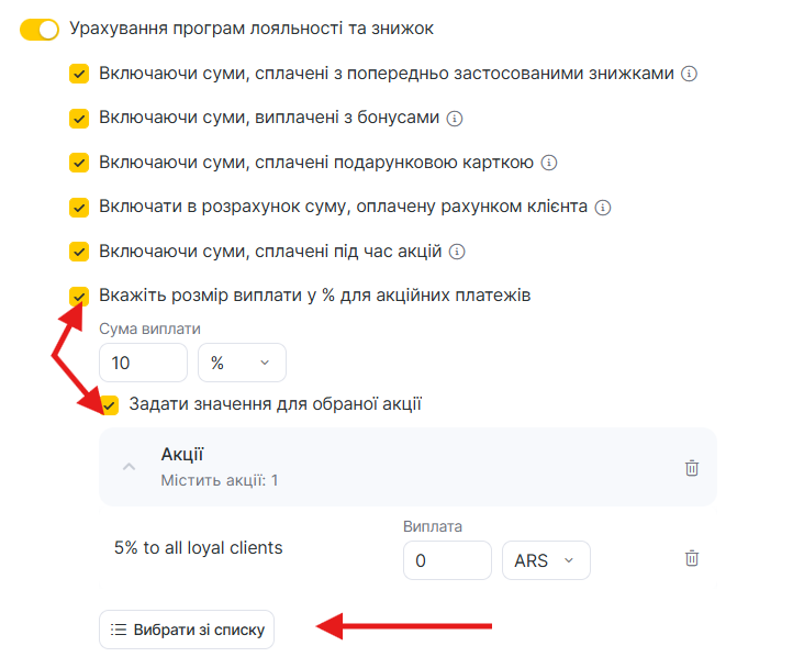 Цей блок дозволяє визначити, які суми враховуються при розрахунку винагороди, якщо клієнт використовує знижки, бонуси, абонементи або бере участь в акціях.