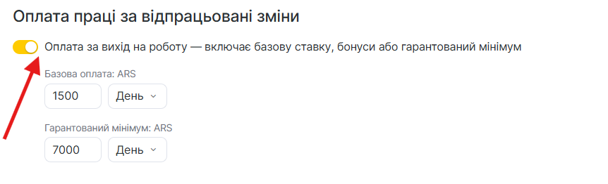 - Увімкніть опцію Оплата за вихід на роботу, яка може включати базову оплату, додаткову винагороду або гарантований мінімум.