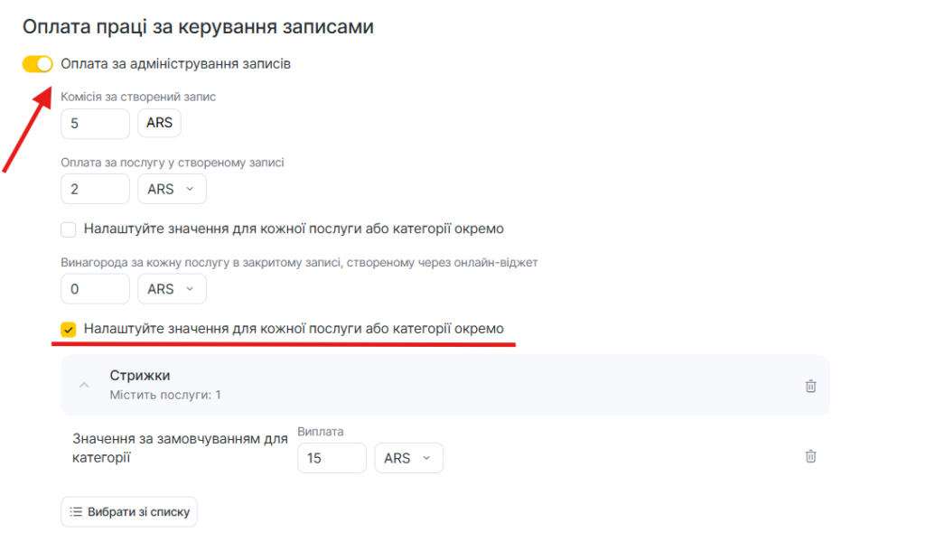 - Послугу в закритому записі, створеному через онлайн-віджет (у відсотках або у валюті). У цьому випадку нарахування здійснюються адміністратору, який створив запис.