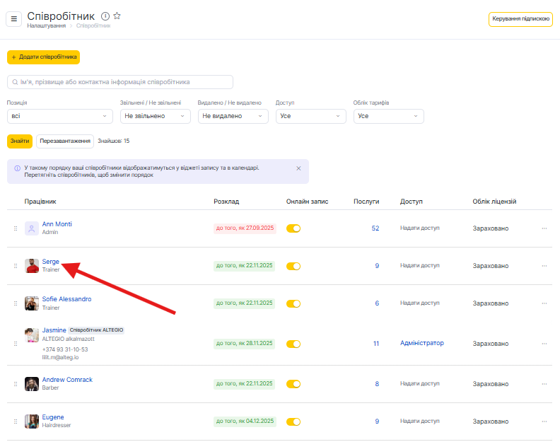 У системі Altegio ви можете зручно керувати всіма налаштуваннями співробітників в одному розділі. Перейдіть у Налаштування → Налаштування запису → Співробітники, щоб переглянути та налаштувати профілі.