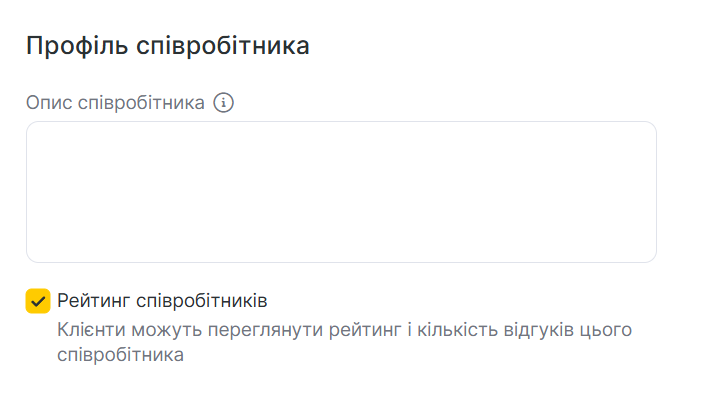 Профіль співробітника: додайте опис, який побачать клієнти при записі онлайн, та за потреби відображайте рейтинг і відгуки.