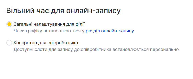 - Загальний для філії: використовуйте стандартний час онлайн-запису.