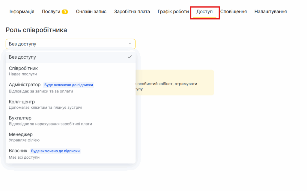 Вкладка «Доступ» дозволяє визначити, що може робити кожен співробітник у системі Altegio. Тут ви призначаєте ролі, права й доступ співробітника. Рівень доступу також впливає на вашу ліцензію Altegio.