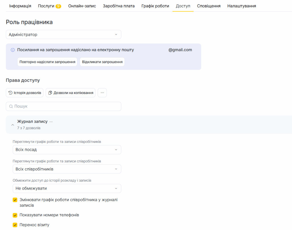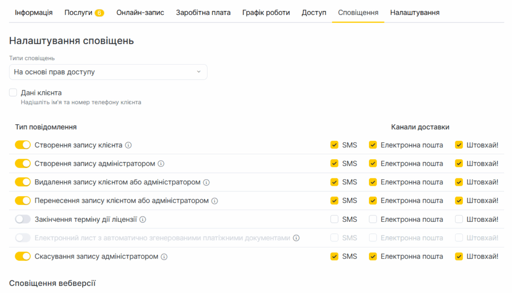 Вкладка «Сповіщення» дозволяє налаштовувати, як кожен співробітник отримує повідомлення про записи, дії клієнтів та інші події. Це допомагає команді бути в курсі й оперативно реагувати.