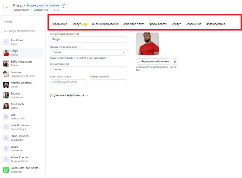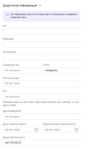 Вкладка «Інформація» видна тільки вам і інтегрованим системам з доступом до даних співробітника. Клієнти побачать лише ті публічні дані, які ви вирішили показати.