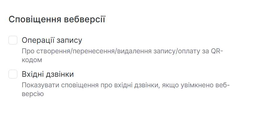 Типи сповіщень: оберіть події, які викликають сповіщення (створення запису, скасування, перенесення, завершення підписки, скасування адміністратором).