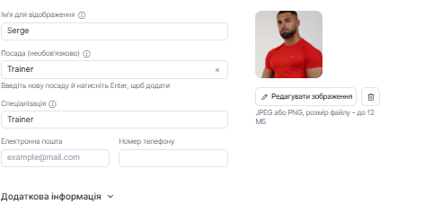 Основні дані профілю: додайте або оновіть відображуване ім’я (видиме клієнтам), посаду, спеціалізацію (також відображається клієнтам) та контактні дані.