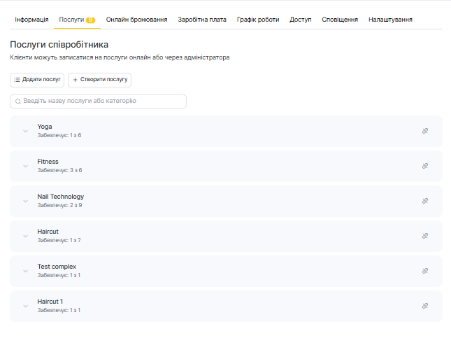Вкладка «Послуги» дає змогу керувати тим, які послуги може надавати співробітник і як вони відображаються для клієнтів. Ця вкладка безпосередньо впливає на видимість в онлайн-записі, розклад і ціни для кожного співробітника.