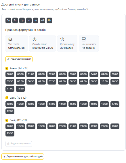Доступні слоти: оберіть і налаштуйте, які часові слоти клієнти можуть бачити та бронювати.