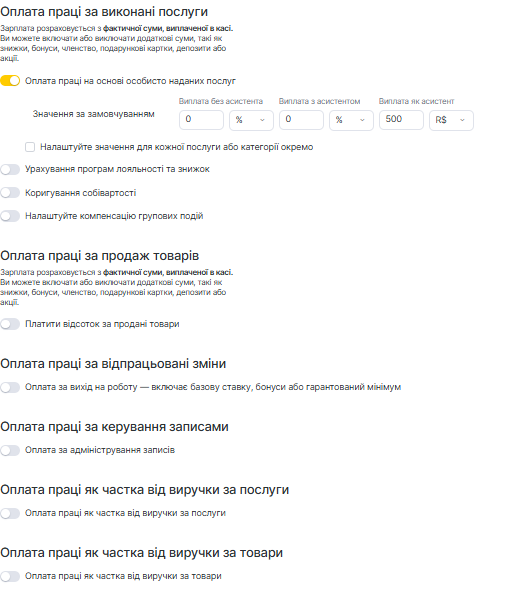 Вкладка «Розрахунок ЗП» дозволяє налаштувати, як кожен співробітник отримує оплату за свою роботу. Тут ви визначаєте види виплат і комісій — від надання послуг до продажу товарів і змінної роботи.
