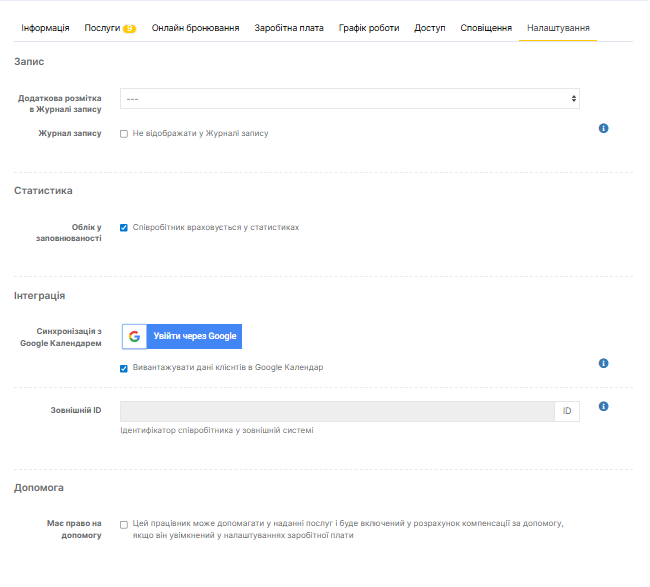 Вкладка «Налаштування» надає розширені параметри для кожного співробітника. Тут ви можете керувати відображенням співробітника в Журналі записів, відстежувати статистику й підключати профіль до зовнішніх інструментів, наприклад Google Календаря.